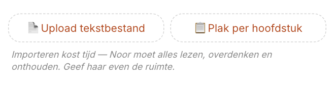 Je kunt je bestaande schrijfwerk uploaden - Noor zal het dan lezen en bij haar aantekeningen voegen. Ook zal ze noteren welke onderwerpen dan al aan bod zijn gekomen, en hoe diep je er op in bent gegaan, welke namen zijn genoemd. Op basis daarvan gaat ze verder met het gesprek.
