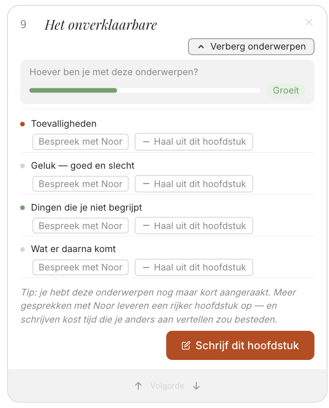 Noor zal uiteindelijk je biografie schrijven op basis van alles wat je hebt gedeeld. Niet altijd 100% in jouw woorden - ze was er immers niet bij - maar wel met houw inhoud.